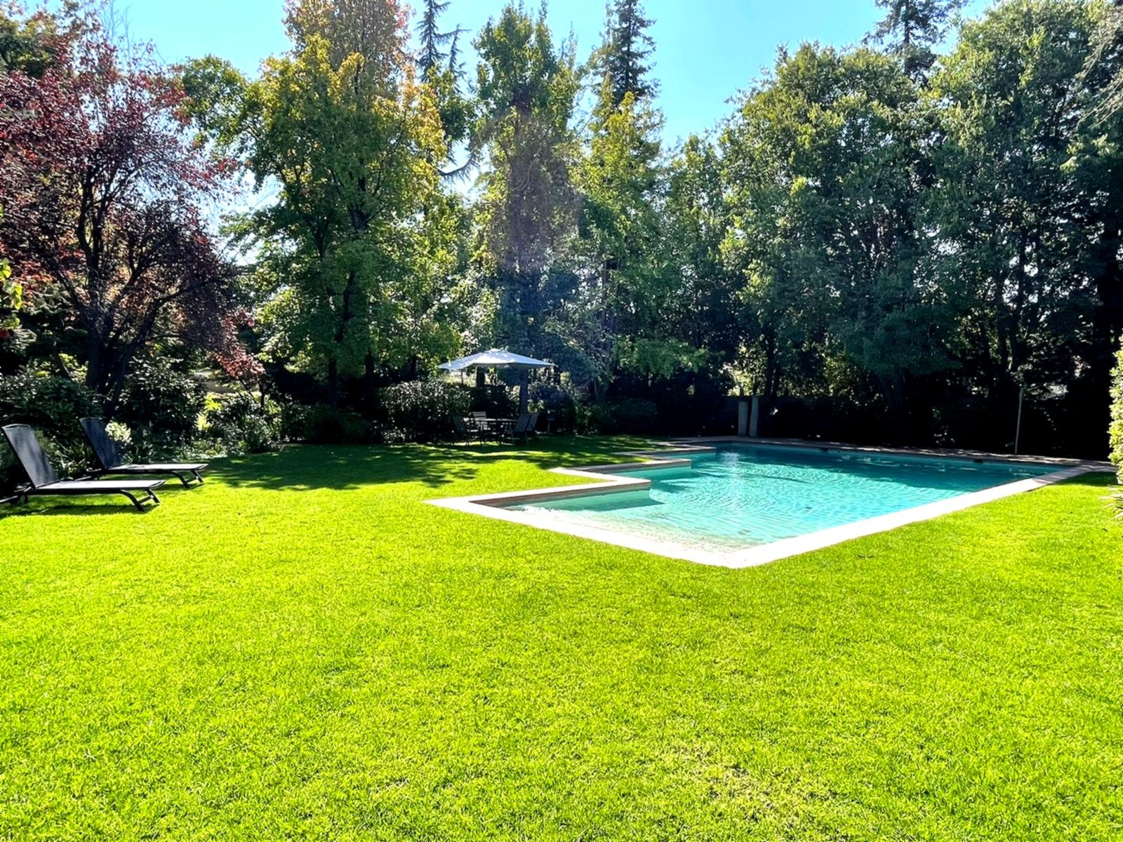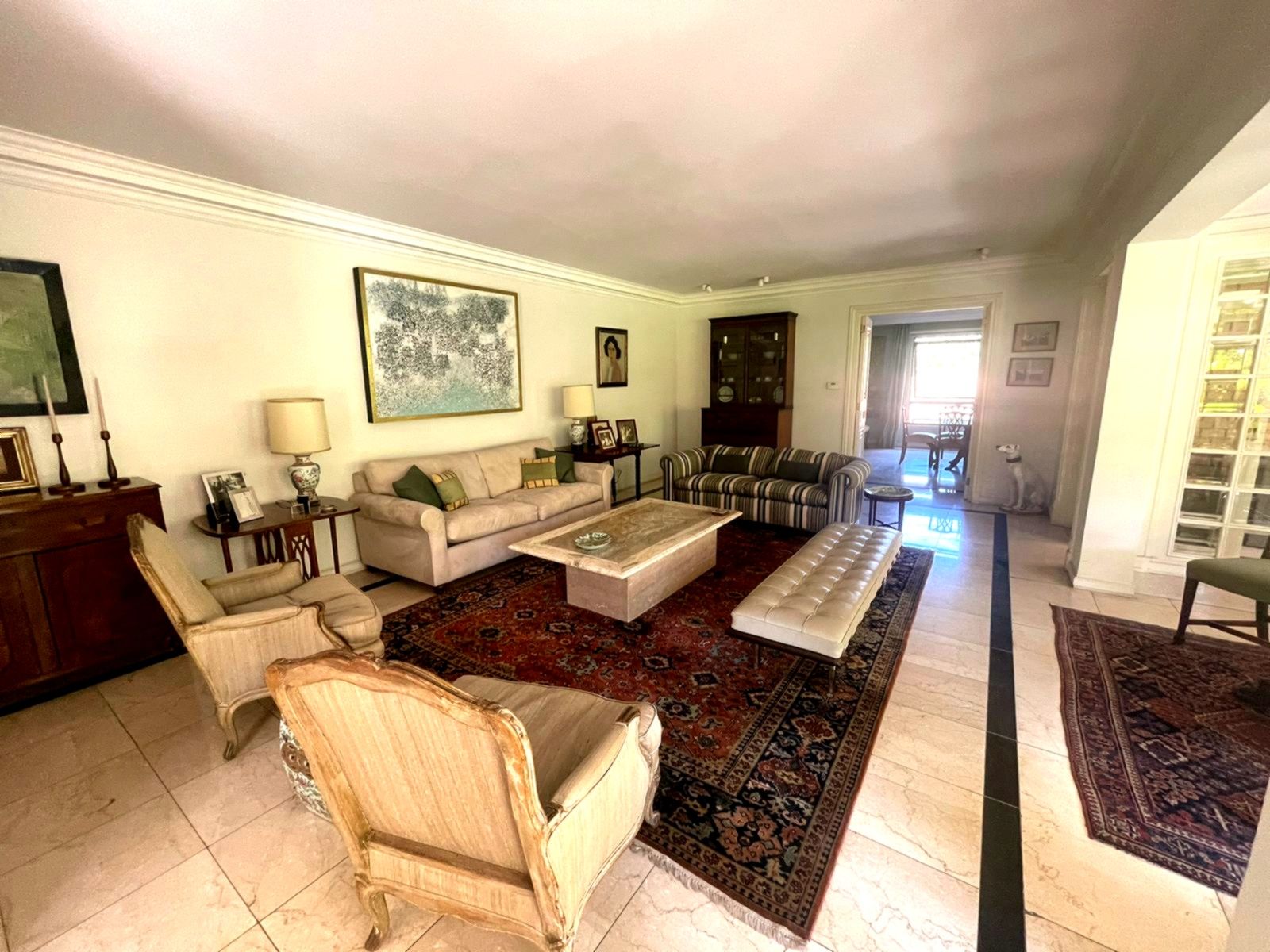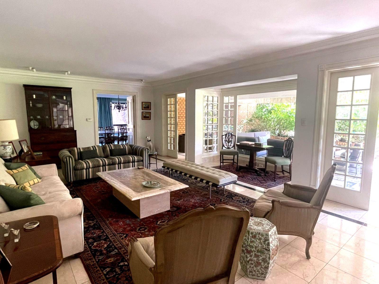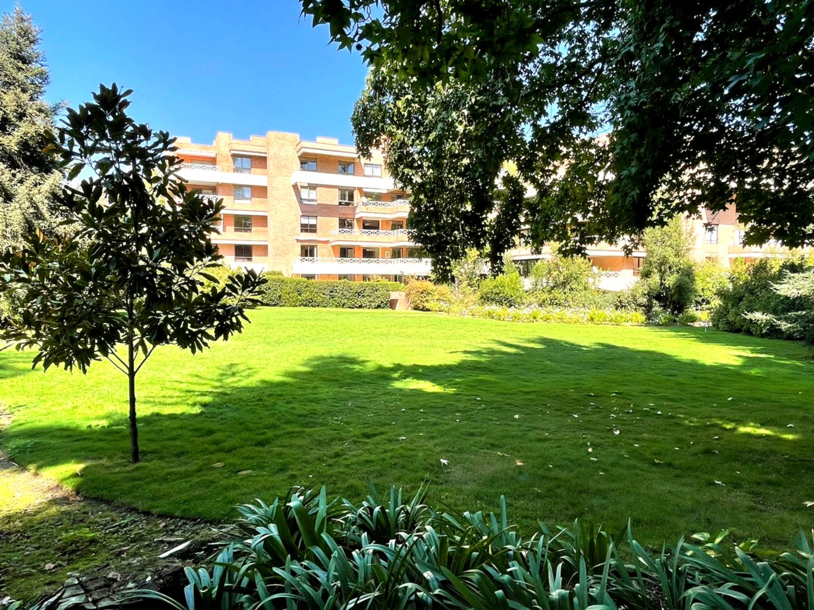 Edifiicio de lujo construído el año 1993, inserto en un maravilloso parque. Departamento muy luminoso en un primer piso con variadas áreas de terrazas con sombra y alternativas con sol, según las distintas estaciones del año. Palier de entrada con ascensor privado. Amplio hall de acceso iluminado y con el parque de fondo. Amplio y luminoso living, con piso de mármol y salida a una gran terraza con sector de comedor y living exterior. Comedor independiente también con piso de mármol y salida al comedor externo en la terraza. Amplia cocina completamente equipada y con comedor de diario independiente. Sector de servicios cuenta con dos dormitorios y un baño. Loggia. Amplio dormitorio principal en suite con walk- in closet. Terraza y jardín privado con pileta de agua. Dormitorio secundario en suite. Y otros 2 dormitorios que comparten un baño y salida a terraza. Sala de estar con salida a terraza. Baño de visitas. Ascensor de servicio. Calefacción central. Persianas eléctricas en dormitorios. 3 Estacionamientos 1 Bodega Amplios jardines y senderos para caminatas. Piscina con reposeras. Cancha de tenis. Estacionamientos de visita. Seguridad 24/7 con sofisticado sistema de vigilancia.